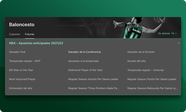 Si lo que buscamos son apuestas especiales a largo plazo, la oferta es excelente. Podremos apostar a qué equipo ganará la liga, o en el caso de la NBA, decenas de apuestas sobre cada conferencia o especiales a jugadores (MVP, Rookie del año, etc).