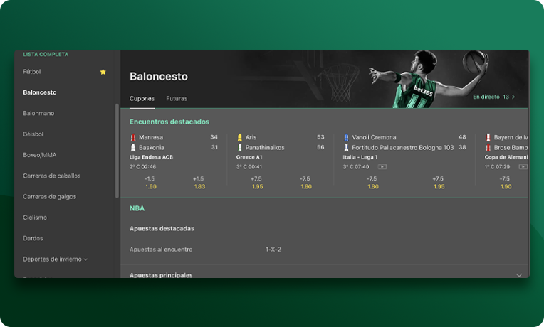 Apostar al baloncesto es muy fácil. Sólo tienes que acceder al deporte de Baloncesto en el menú de la izquierda, y te aparecerán todas las ligas disponibles. A continuación, sólo tendrás que elegir la liga en la que quieres apostar, aunque si buscas un partido concreto también puedes optar por utilizar el buscador.