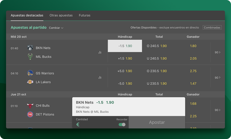 Apostar al baloncesto en bet365 es muy sencillo, además de tener disponibles una inmensa variedad de mercados y unas cuotas que siempre son aceptables. ¿Quieres aprender cómo hacerlo?