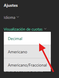 Para eso, tienes que dirigirte a la sección inferior del sitio de apuestas, y verás la opción “Visualización de cuotas”, allí tienes que hacer clic, y elegir una de las tres opciones disponibles.