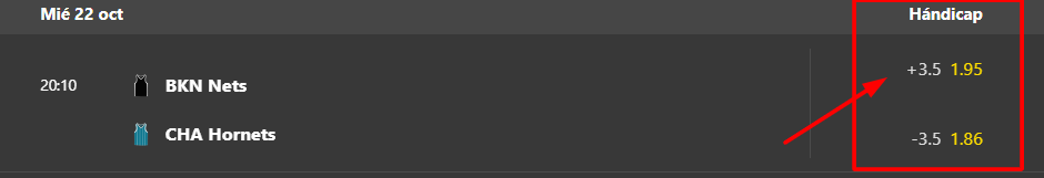 El Hándicap es una ventaja que se le otorga a un equipo frente a otro. Por ejemplo, si ves un equipo con un hándicap -10.5, significa que ese equipo empieza la apuesta perdiendo por 10.5 puntos. En ese caso, para ganar la apuesta, tu equipo debe ganar por 11 o más puntos.