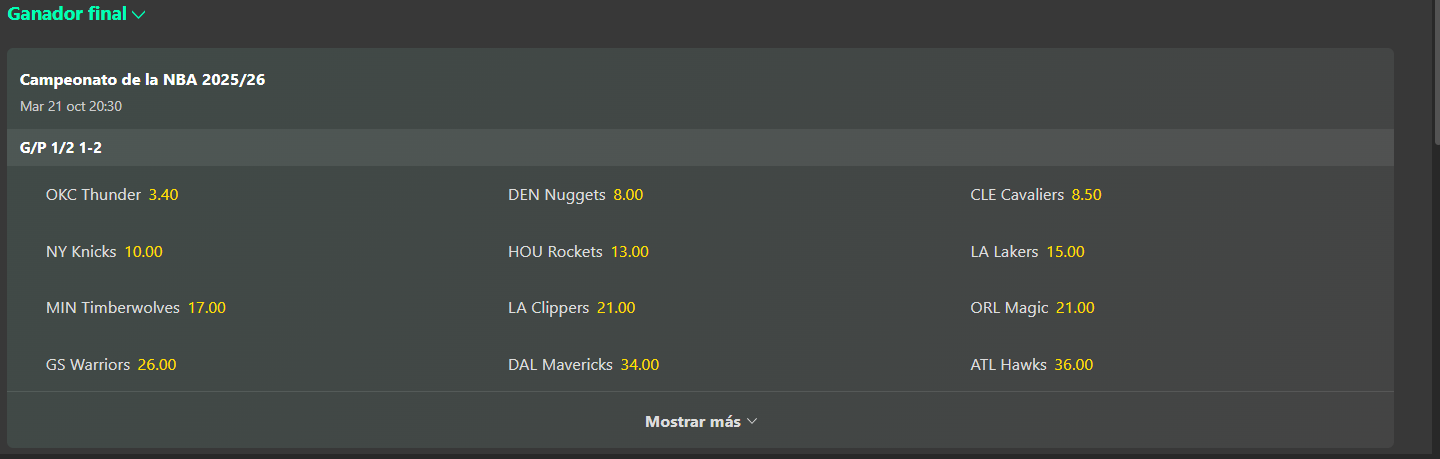 Cómo puedes ver en el ejemplo, tienes la posibilidad de apostar al ganador de la NBA. Puedes apostarle a los Lakers, a los Boston Celtics, a los Golden State Warriors o a los nuggets de Nikola Jokic. Puedes encontrar estas apuestas en la sección futuras de la pestaña basketball en las casas de apuestas deportivas.