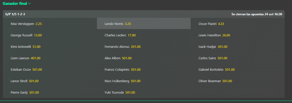 Puedes apostar al ganador de la temporada final, esta apuesta te permite obtener cuotas muy altas, pero, solo podrás retirar tus ganancias al final de la temporada, por lo que debes analizar muy bien antes de hacer algún movimiento de este tipo. También debes saber que, mismo que no aciertas el ganador, puedes cubrir tu apuesta en Fórmula 1 en 2025 con la opción de G/C. Por lo tanto, si tu elección queda en segundo lugar, aún tendrás ganancias.